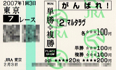 ・2007/02/24 中山12R D1200 1126 05着/16頭 57.0木幡初広 4歳上1000万(混)[指]