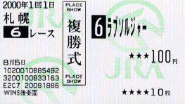 ・2000/09/03 札幌06R T1200 1130 09着/16頭 53.0松永幹夫 旧3歳500万(特指)